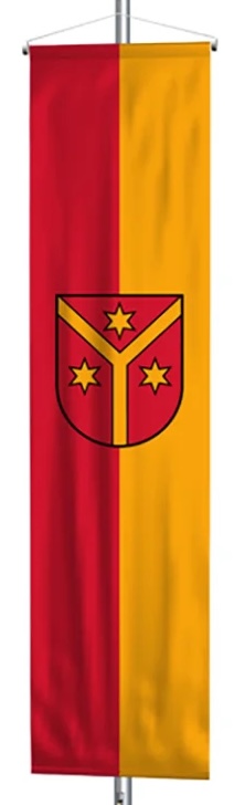 The arms show a yellow/golden upright pall on red, with a six-pointed star in each of the three fields.