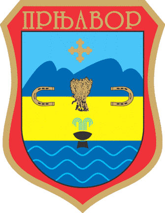 The flag of Prjnavor (photo) is white with the municipal coat of arms, "A fess or dividing it in chief celestial a mountain azure and azure three wavy bendlets celestial and overall a garb or between two horse shoes of the same to dexter and sinister and a Greek cross bottony also or in chief and a fountain natural sable issuing water celestial in base". The shield is set on a shield-like, golden-edged red cartouche, inscribed the golden municipality name above.
