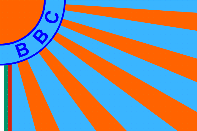 The Bulgarian Air Force (Военновъздушни сили) has a light blue flag with an orange quarter of sun placed in the upper right corner, with its five orange rays over the field. A sixth vertical ray placed at hoist consists of national colors. The abbreviation (BBC) of the Air Force is placed on an arc around the sun.