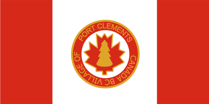 The flag of the Village of Port Clements, British Columbia, is a Canadian style vertically divided red-white-red with village logo on it. Photo of the flag thanks to Heather Nelson-Smith, Clerk/Treasurer.