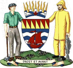 Barry wavy Azure and Argent a Cape Breton sloop Gules, a chief paly