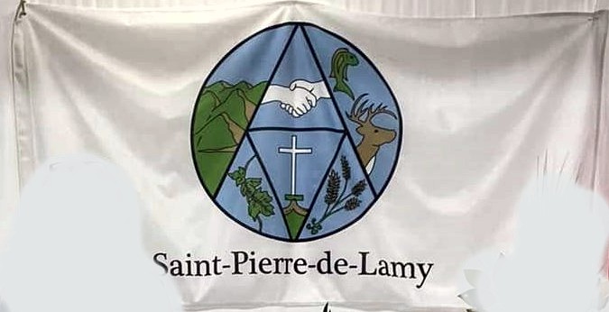 The flag of the Municipality of Saint-Pierre-de-Lamy in MRC Temiscouata, Quebec, is white with the municipal emblem and name Saint-Pierre-de-Lamy below it: