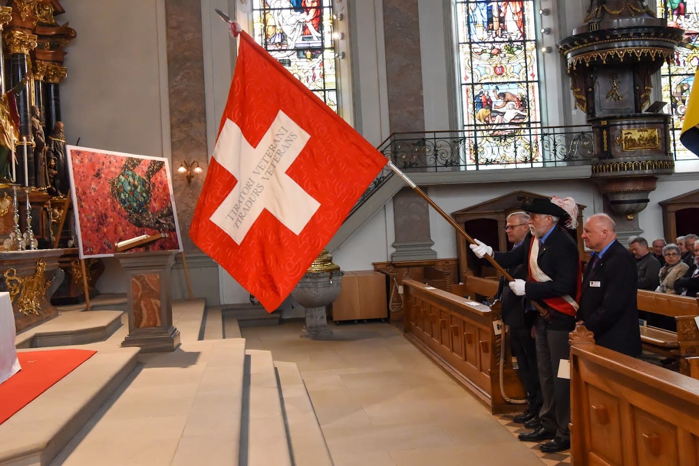 the cantonal and regional veterans organizations. The current flag was introduced in 1958. It shows the white Swiss Cross on red with the organization's name with