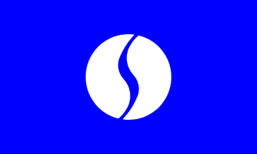 This flag shows a plain blue field bearing a white logo which consists of two comma-shaped elements (not unlike the taeguk emblem on the national flag of South Korea and its predecessors), placed in such a way as to suggest an "S" on a disc, using negative space.