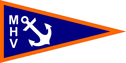 The pennant is blue fimbriated orange, at hoist is a white inscription „MHV“ ordered vertically and a white anchor in bend. The club is based in Greve Strand.