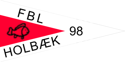 The pennant is white, issuant from hoist is a red triangle containing a black fish, the white edges have black inscriptions as follows: "FBL" (top) "HOLOBĘK" (bottom) and "98" (fly). Holbæk is located on the southern bank of the namesake fjord in Zealand about 30km west of Roskilde.