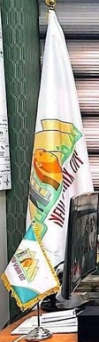 The upper left and lower right corners have rounded blue triangled with a gold contour on the desk flag.