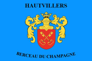 The flag of Hautvillers is blue with the coat of arms, the name of the commune above and the motto "cradle of Champagne".