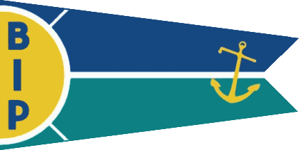 The burgee granted to ships awarded the BIP certification is trapezoidal, swallow-tailed, horizontally divided blue-green with a thin white line separating the two fields. A yellow half-sun outlined in white and emitting two white rays, charged with the blue letters "BIP" displayed vertically is placed along the hoist. A yellow slanted anchor is placed at fly.