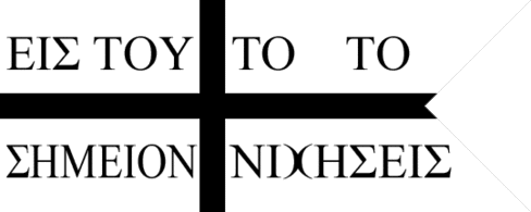Although this is in turn a lose translation of a Greek original ("ἐν τούτῳ νίκα", merely "in this, conquer"), the Greek text on this flag is less terse and reads thus: "ΕΙΣ ΤΟΥ" on the upper hoist quadrant, "ΤΟ ΤΟ" on the upper fly, "ΣΗΜΕΙΟΝ" on the lower hoist, and "ΝΙΧΗΣΕΙΣ" on the lower fly. This is apparently meant to read "Εις τουτο το σημειον νικήσεις" (litt. "You win at this point", though meant to translate the Latin form by including "σημειον" to mean "signum"), but the letterform chosen for kappa is unexpectedly a ")(" shape, characteristic rather of a chi (surely so in the 4th century, let alone in the 19th!), yielding instead the theologically perplexing "Εις τουτο το σημειον νιχησεις" = "At this point, you will laugh". Which I did.