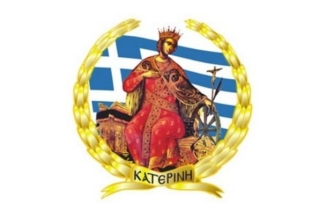 The flag of the former municipality of Katerini (photo, Town Hall, 2007) was white with the emblem of the town - St. Catherine in a laurel wreath with the Greek flag behind her - and its name below in black. The new municipality uses the same emblem and, probably, the same flag.