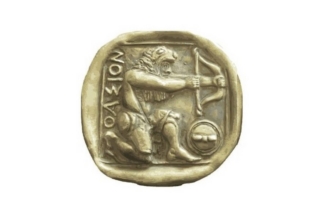 The flag of Thasos is white with the municipal emblem. Based on a single photograph it appears not to have the name below the image.