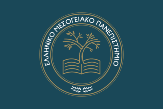 The flags of the Hellenic Mediterranean University are white or dark blue with the logo in