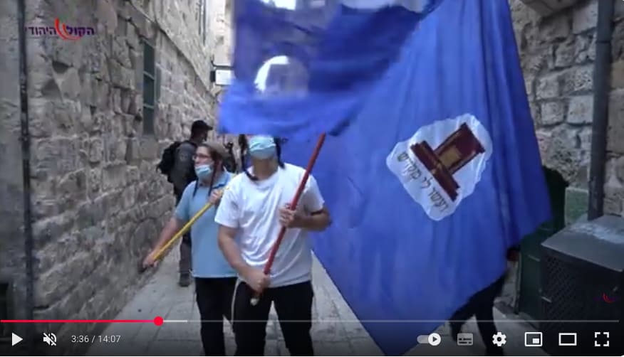 The flag is seen during the "סיבוב שערי הר הבית" (Rounding gates of the Temple Mount), more commonly known as "סיבוב שערים" (Rounding gates) which is a unique prayer ceremony, more like a Procession, that is mentioned in ancient Jewish sources thousands of years ago. The participants in the ceremony use to tour around the gates of the Temple Mount, reciting Psalms, observing the customs of mourning the destruction and special prayers for rebuilding the Temple. In modern times, during the British Mandate, Prof. Ze'ev Vilnai renewed the custom, surrounding the gates of the Old City on the evening of "תִּשְׁעָה בְּאָב", (transliterated Tisha B'Av), meaning literally the "ninth of Av" (Av being the eleventh month of the civil year and the fifth month of the ecclesiastical year on the Hebrew calendar and it is observed by fasting in Judaism, on which a number of disasters in Jewish history occurred, primarily the destruction of both Solomon's Temple by the Neo-Babylonian Empire in 586 BC (Other sources, mention 587 BC) and the Second Temple by the Roman Empire in Jerusalem in 422 BC).