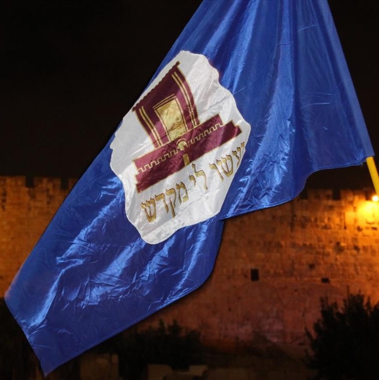 The predominant flag version shows the ancient or prophesied Third Temple in Jerusalem, with the writing below: "And they made me a temple" (ועשו לי מקדש, wasu li mikdash).