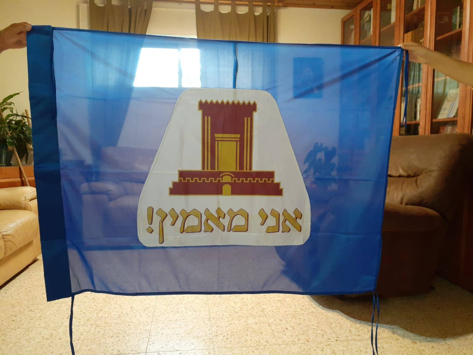 Another version of this flag, with the writing מהרה יבנה המקדש (Soon the Temple will be built).