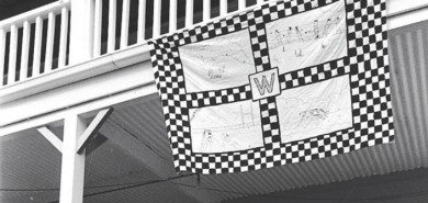 Image of news article and hand made checked border flag close up (nz-whangamomona89.jpg) from Facebook post: https://www.facebook.com/61569719403318