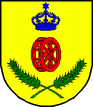 Shield Or a watermill wheel Gules between a Marian crown Azure on chief and two wheat ears Vert in saltire.