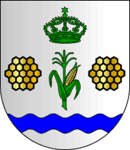 Shield Argent a maize stalk Vert fructed Or between two honeycombs, each with 19 cells Or fimbriated Sable set 3:4:5:4:3, in chief a Marian crown Vert, in base a barrulet wavy Azure. Mural crown Argent with three visible towers (village rank) and white scroll reading in black upper case serifed letters "PINDELO DOS MILAGRES"