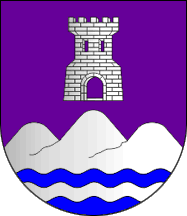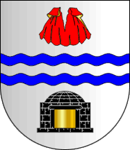 Shield Argent two barrulets wavy Azure, in chief a ripped cape Gules lined Or, in base an oven Sable masoned Argent and open Or. Mural crown Argent with three visible towers (village rank) and white scroll reading