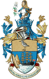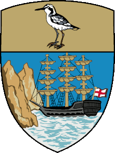On 30th January 1984 the St. Helena Government Gazette published an illustration and blazon of Arms for St. Helena and announced that the Earl Marshal had been commanded to register them at the College of Arms. According to the Office of the Chief Secretary, St Helena, the date on the Royal Warrant that granted the Arms is 04 October 1985. Flag books give 1984 as the date when the shield of the Arms was adopted as a Blue Ensign defacement, but a 1993 Flag Research Center information sheet on the St Helena Blue Ensign stated that ‘the date of authorization of the [new] flag badge is unknown; the flag is to be phased in during 1994 as stocks of the previous design are depleted’.” A plover, charadrius sanctaehelenae, known locally as the Wire Bird, is in the upper part of the shield, above a revised drawing of the coastal scene that formed the original badge. The defacement on the Union Jack of the governor has the same shield, but also the scroll from the arms bearing the motto LOYAL AND UNSHAKEABLE, set on a white disc surrounded by a laurel-leaf garland. The scroll was on the Governor’s flag in 1997, but has since been removed.
