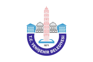 The flag of Yenişehir (photo, photo) is white with the municipality's emblem in the middle. "Belediyesi" means "Municipality".