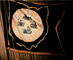 The first known flag of Euclid is a golden-fringed swallowtail flag with a blue field and the city's old seal plastered in the middle. Around the seal is the outline of Ohio in gold. Found in John M. Purcell's "Unusual Flags of the United States of America"