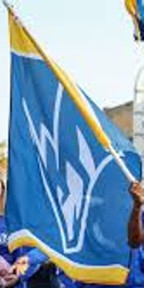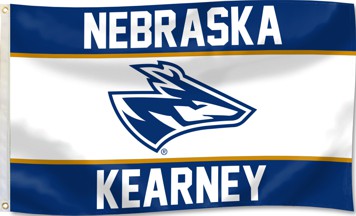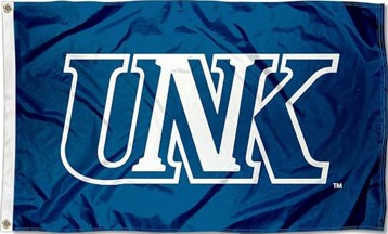 An institutional flag of the University of Nebraska at Kearney (obtained from https://m.media-amazon.com/images/I/61w9hGrLg7L._UF1000,1000_QL80_.jpg)) is blue with the UNK letters in white.