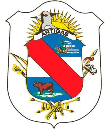 The coat of arms was approved on 12 July 1964, being designed by Walter F. Planke. It is a white shield with three points at the top, the ones on the sides being flat and the central one rounded. In the center of the shield, another shield is displayed which has its background as the flag of Artigas, recognizing the revolutionary hero as the namesake of the department (three bands of blue-white-blue with a diagonal red band from top-left to bottom-right). The lower left depicts a cow over grass for ranching; the upper-right depicts rice and sugarcane together representing the primary agricultural industry here. To the right, wavy lines represent the confluence of the Cuareim and Uruguay rivers, with factory chimneys over them for industry. Cresting the inner shield is a ribbon reading ARTIGAS in black over silver. Just above, a lapwing appears watching, and is in front of a sun recognizing the National Flag. To the sides of the inner shield, indigenous tools used by the Charrúa Indians are seen: to the left, a bow and machete; to the right, a lance with pennant and a hammer; and to the bottom, numerous arrows.