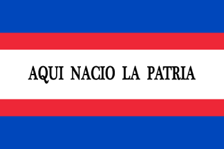 The Soriano Department flag has a blue bar on the top taking 2/9 of the flag's height; a red one taking 1/9; a white one taking 3/9; a red one taking 1/9; and a blue one taking 2/9. In the center, text reads AQUI NACIO LA PATRIA [Here, the Fatherland was born]. Red, white, and blue are the colors on the Artigas flag.