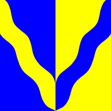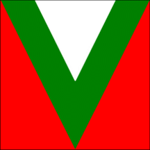 1) On flags any ‘V’ shaped charge on a flag irrespective of the width of the arms. The standard orientation of a chevron on flags is the same as 2) below so when the apex is towards the top of the flag it is a standard or simple chevron, when towards the base of the flag a reversed on inverted chevron, however, when the apex is towards the fly it may be called a hoist chevron, and with the apex towards the hoist a fly chevron (see inverted and reversed).