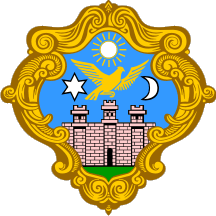 and charged with a number of gold disks surrounded by red roses outlined in blue