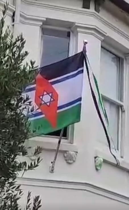 Caption: pictured is a "One State" flag of a united Israel-Palestine. It