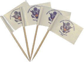 |  ![[Coast Guard Toothpick Flags]](art/mil/coastguard_tpick.gif) Coast Guard Toothpick Flags Paper flags mounted on toothpicks. Approximately 100 per pack. $4.00 pack |  ![[Coast Guard Knit Watchcap]](art/mil/misc/ec80036.gif) Coast Guard Knit Watch Caps $8.00 |  ![[Coast Guard Mini Banner]](art/mil/coastguard_minibanner.gif) Coast Guard Mini Banners $4.00 each 11 available |