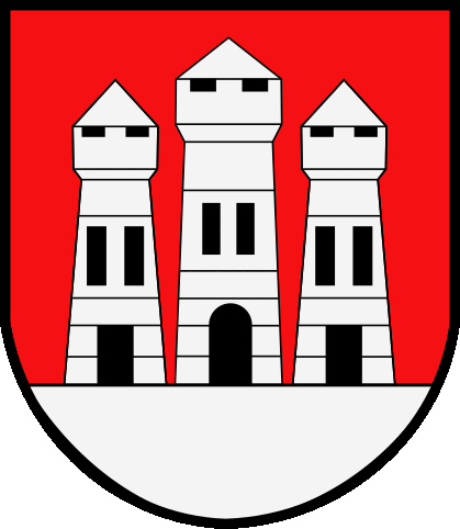 In a later form, the coat of arms depicts three silver, rectangular towers, each with a tall, round gateway, on a red shield. Each tower is topped with a projecting crenellated cross of three battlements. The central tower, with its hipped roof, is one battlement width higher, and its round-arched gateway is also taller. The side towers have tall, pointed roofs. The town colors formerly were silver (white) and red.