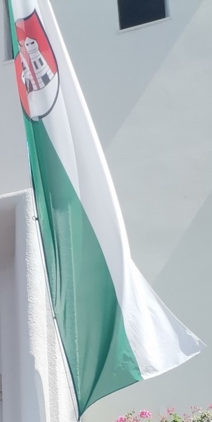 The Town Flag Stadtfarben in 1926 was devised green and white. The coat of arms is shown and described in the web page (in German).