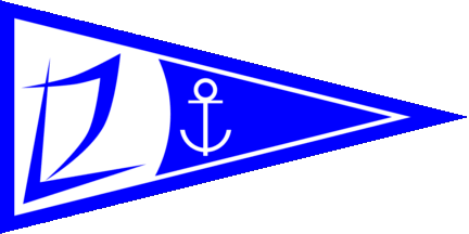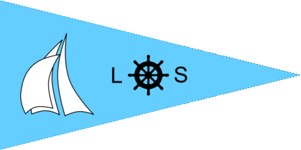 The pennant is light blue with a white sailing ship without hulk at hoist and black initials "L" and "S" flanking black steering wheel.