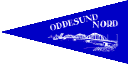 The pennant is blue and only the rear is known. On centre is white bridge with three arches under a white inscription "ODDESUND" (parallel to upper edge) and "NORD". Oddesund Nord is a railway station on the northern bank of the namesake sound, a part of the Limfjord.