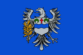 The flag is a banner of arms, blue with the content of the shield: photo (2025), photo (2025), photo (2024), photo (2023), photo (2018), photo (2008).