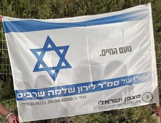 bottom blue stripe in white reading "לאורו של סמ"ר שחר סטרוג"