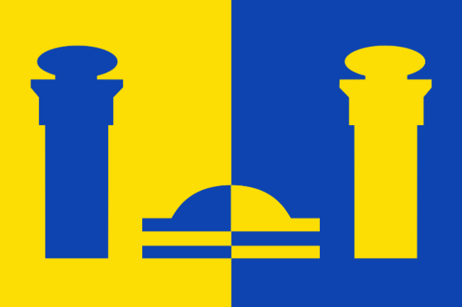 The flag of Bennekom was established in 2012 by Cees van der Knaap. The flag is based on the municipal flag of Ede, to which Bennekom belongs; blue and yellow with two additional pillars with spheres.