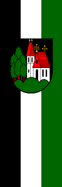 | Description of arms (German): | In Schwarz auf grünem Dreiberg (auf der mittleren und linken Kuppe) eine silberne, eintürmige, rot gedeckte und schwarz geöffnete, gotische Kirche mit zwei goldenen Knäufen am Keildach des Turmes und zwei goldenen Giebelkreuzen am Satteldach des Schiffes; rechts begleitet von grünen, dichten Laubbäumen (= Wald). |