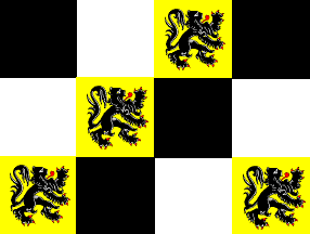 The official flag of "RC Lokeren", 1924, as shown on the club's website, was already mostly black and white, incorporating St. Lawrence's gril from the municipal arms of Lokeren of the time and a yellow lion armed and langued in red on a black field.