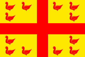 The municipal flag of Maldegem is yellow with a red cross forming four quarters each charged with three red merlettes placed 2 and 1.