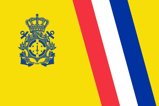 Its flag is yellow with its coat of arms placed at hoist side of the flag. Three diagonal stripes of Dutch national colors are placed at fly.