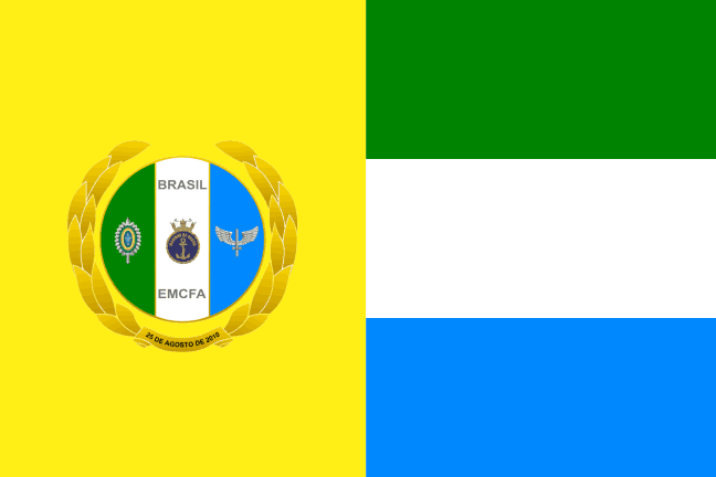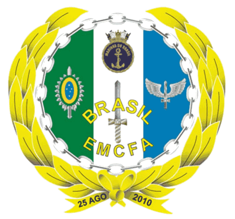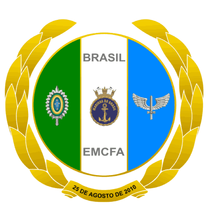 The emblem of the Armed Forces is a vertically divided disc, consists of green, white and light blue vertical stripes. The emblems of the Army (Land Forces), the Navy and the Air Force are placed on each stripe respectively. There are two inscriptions on white stipe, name of the country (BRASIL) is written on upper part, and abbreviation of Joint Staff of the Armed Forces (EMCFA) is placed on lower part of white panel of the emblem. Disc is surmounted by a golden wreath, and the date of creation of new Armed Forces structure is placed on a yellow ribbon underneath (25 DE AGOSTO DE 2010).