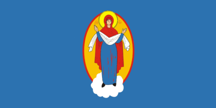 Here is flag of Maryina Gorka and Pukhavichy district. They are two variants, banner of arms (presented always of various web pages) and blue with coat of arms like on photo; some of the variants have the coat of arms shape outlined.