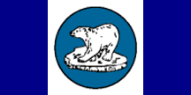 It is a very dark blue and white Canadian pale flag with a large circular emblem on the central panel. This has a heavy black contour line around a blue-grey disc on which there is an image of a polar bear on a slab of floating ice in white with black outlines and details.