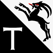 Per bend Argent an Ibex bendwise rampant Sable langued Gules and of the second a tau cross of the First.