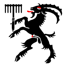 Argent an Ibex rampant Sable langued and prepuced Gules holding a rake.